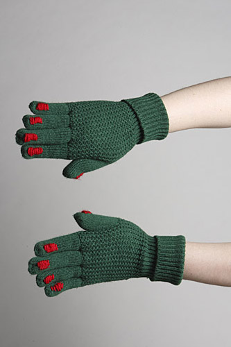 Kynsikkäät (Nailies), 2008 Leathergloves and paint, woolen gloves and thread. 10 x 20 x 1 cm. More images: 1, 2, 3